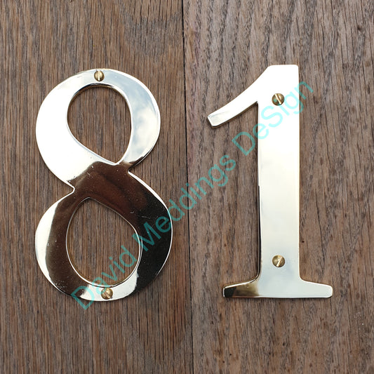 Traditional serif style brass numbers characters hammered, polished or brushed 4"/100mm high Garamond font